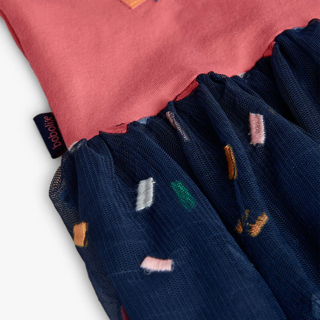 Vestito manica lunga per bambina. Combinando la felpa con il tulle si ha un capo adatto dalla scuola alla cena fuori del venerdì. Disponibile dai 2 ai 10 anni.